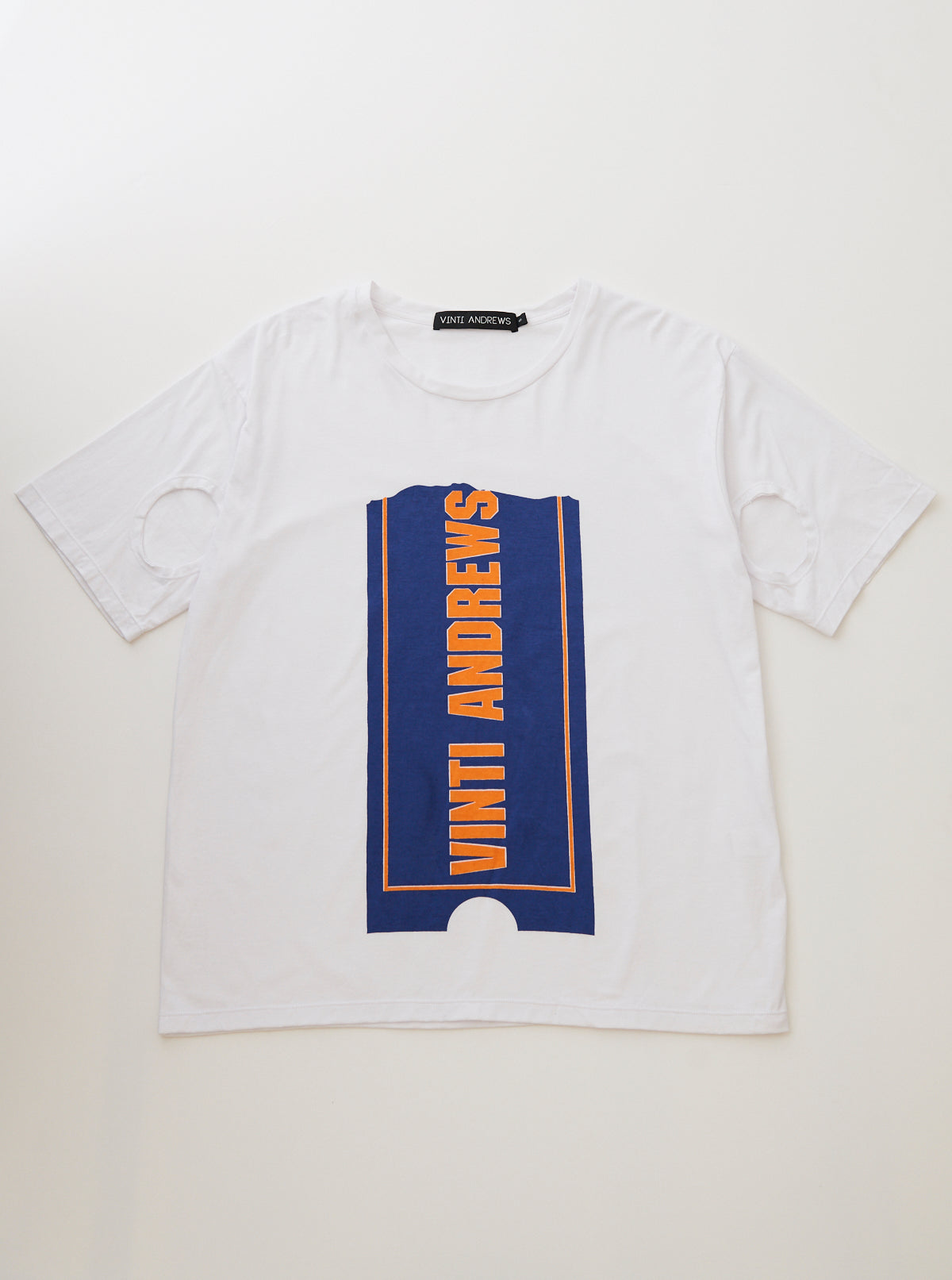 Screen printed T-shirt with cut out armholes on the front sleeves.